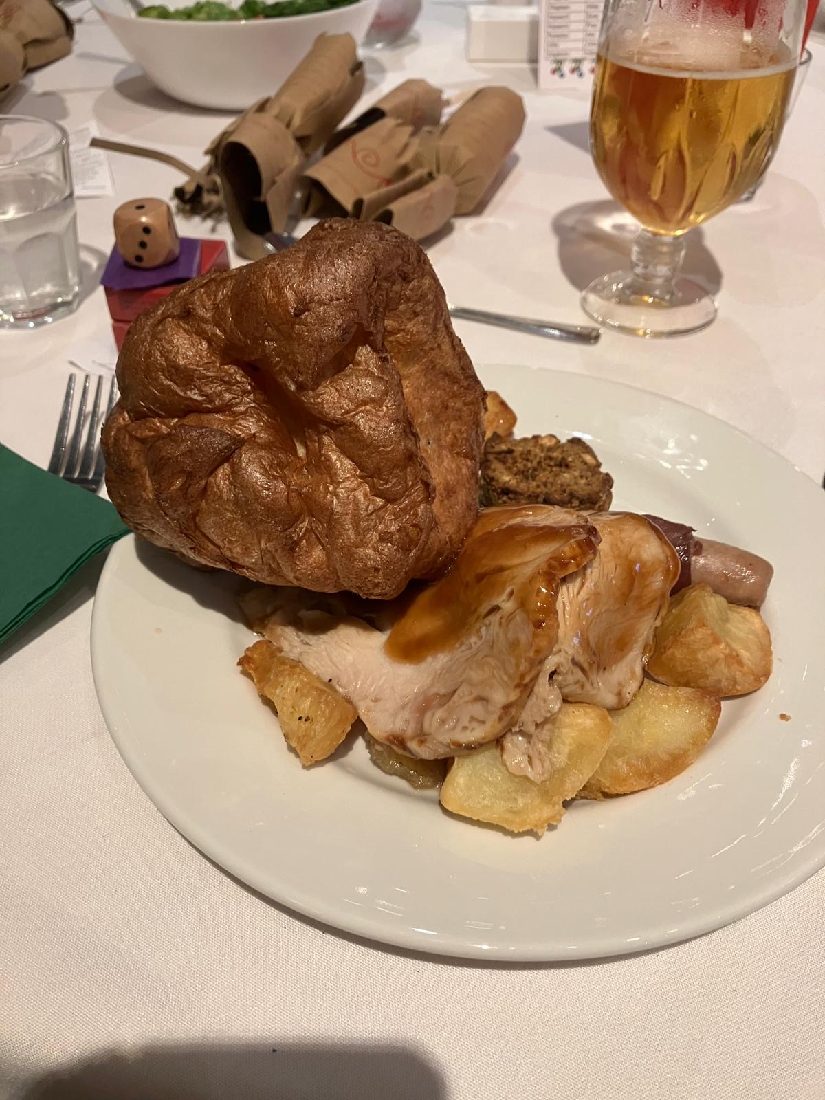 Hand carved roast turkey, roast potatoes, sage & onion stuffing,