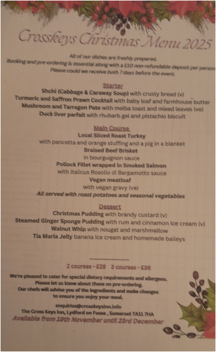 It’s the Christmas menu at £29 for two courses or £36 for three courses. A deposit of £10 per is payable one week before, ie by 9th December.